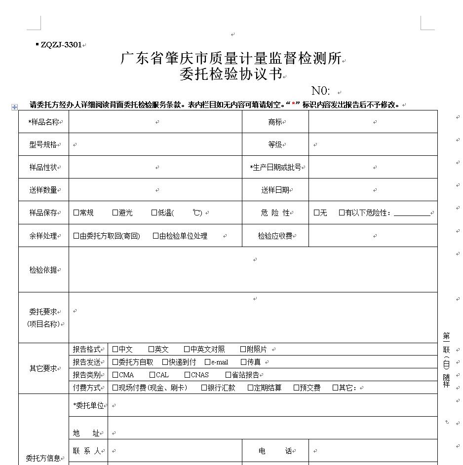 广东省肇庆市质量计量监督检测所委托检验协议书