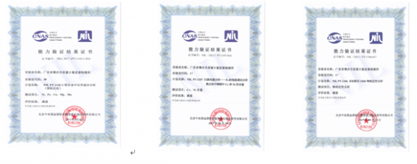 为加强实验室能力建设,提升检验技术水平,今年以来,我所积极参加由北京中实国金实验室能力验证研究中心组织的能力验证试验。据日前公布的报告显示,我所参加的“NIL PT-1142-1 铝合金中化学成分分析(国际比对)”、“NIL PT-1347 扫描电镜分析-X射线能谱法分析奥氏体不锈钢中Cr和Ni的含量”和“NIL PT-1346 未知粉末XRD物相定性分析”能力验证试验结果均为“满意”,并获得能力验证证书。