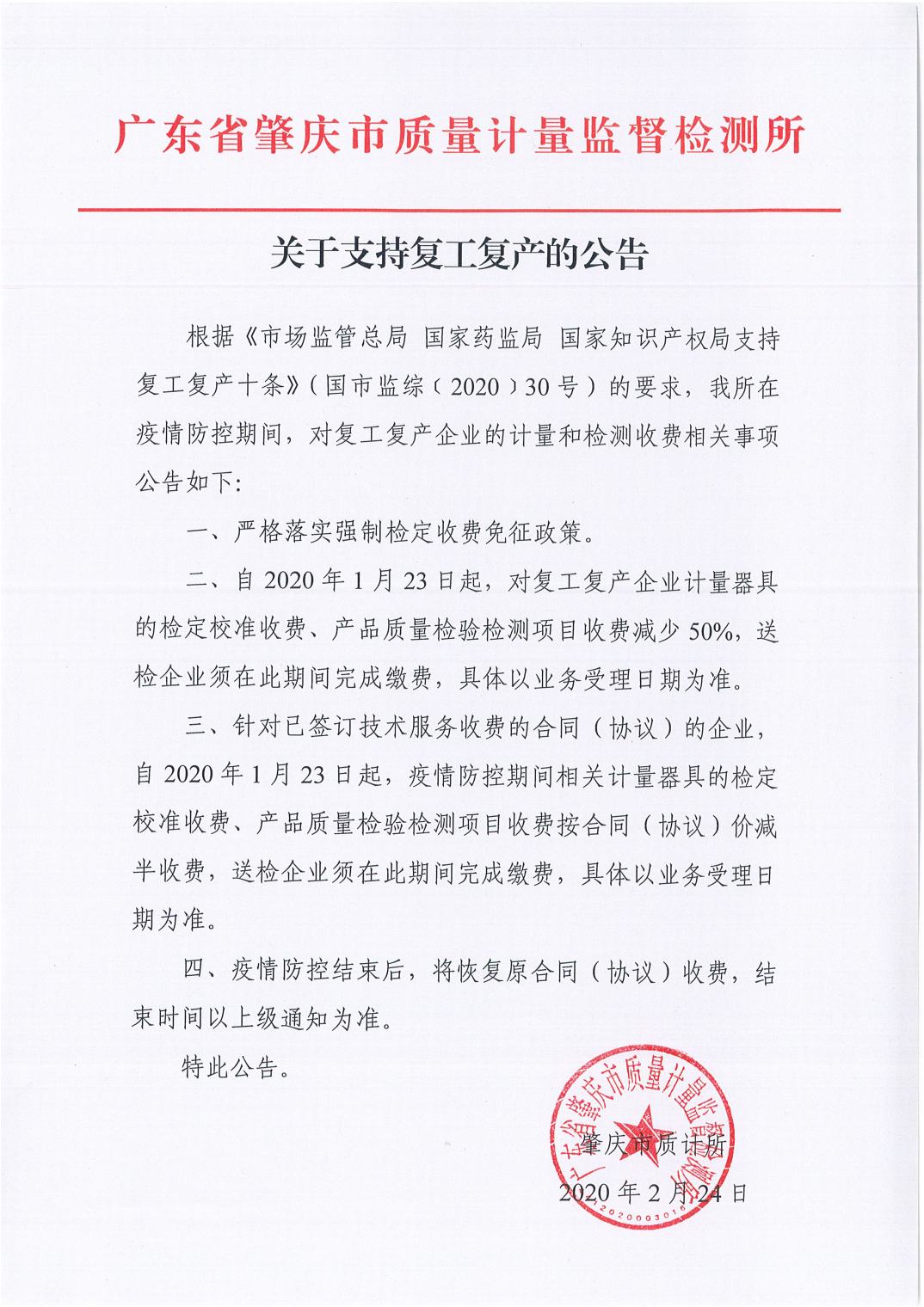 关于支持复工复产的公告