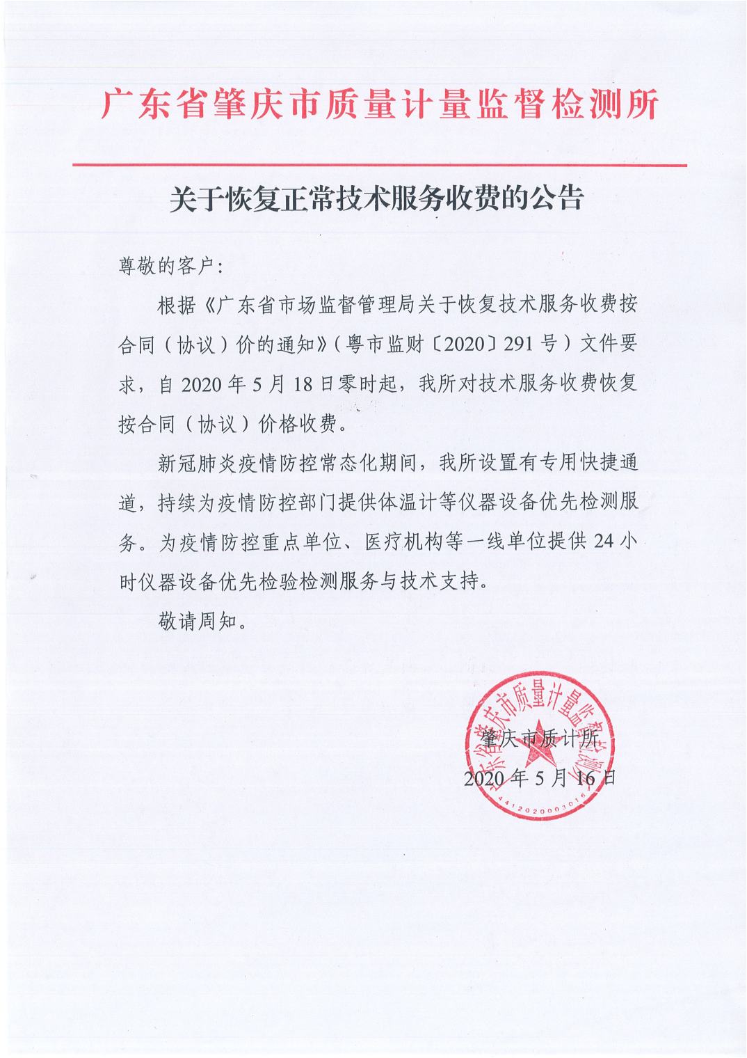 关于恢复正常技术服务收费的公告