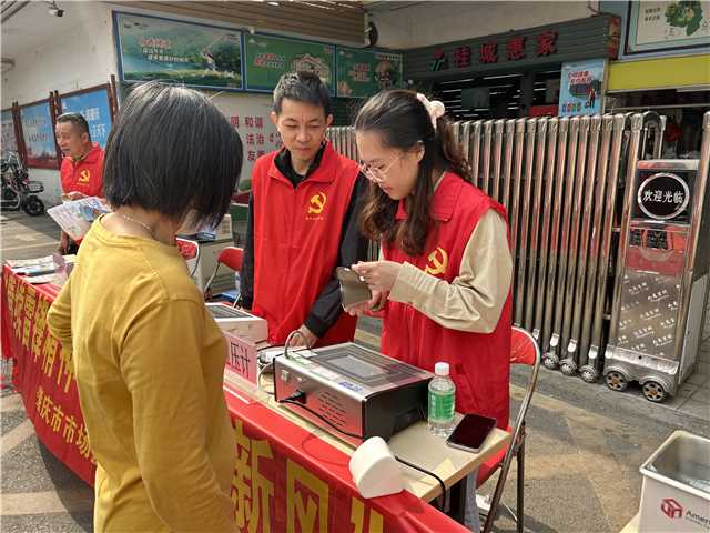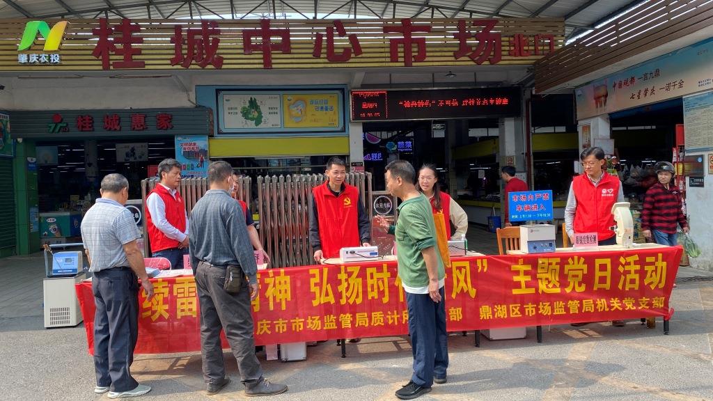 为赓续雷锋精神、弘扬时代新风,根据肇庆市监党委《党建联学共建活动工作方案》精神,3月16日上午肇庆市市场监管局质计所党支部联合鼎湖区市场监管局机关党支部到鼎湖区桂城中心市场开展民生计量免费检定活动,免费为市民检定血压计、体重秤、电子计价秤、测温仪等家庭常用计量仪器,并为市民免费测量眼镜度数和清洗眼镜。民生计量关系群众“菜篮子”、“米袋子”、“油瓶子”,与老百姓日常生活息息相关。在活动中,党员代表们还向群众发放了各类宣传册并耐心地对向现场群众宣传日常生活中有关计量的科学知识,讲解血压计的常见故障、电子秤防作弊等小常识,并就群众提出的计量问题进行了解答,受到了广大老百姓的一致好评。